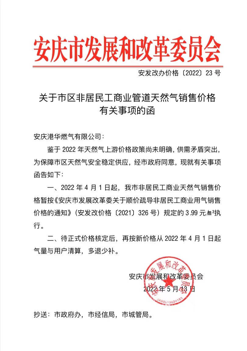 關于市區(qū)非居民工商業(yè)管道天然氣銷售價格有關事項的函(安發(fā)改辦價格〔2022〕23號) 發(fā)布時間:2022-05-20    閱讀次數:9087次