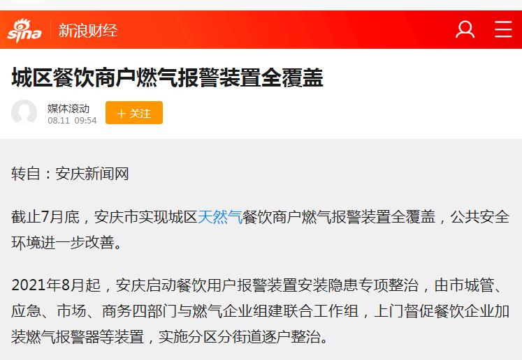 城區(qū)餐飲商戶燃氣報警裝置全覆蓋(轉載于新浪財經)