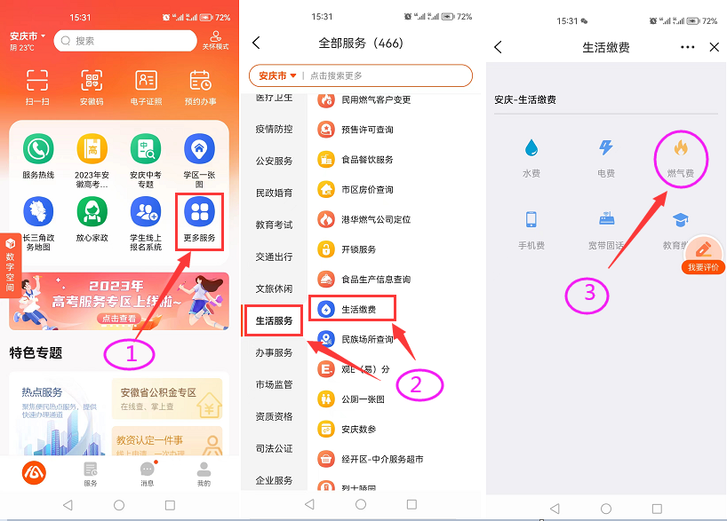 皖事通:安裝并打開皖事通APP,進入“更多服務(wù)”-選擇“生活服務(wù)”-“生活繳費”,點擊“燃氣費繳納”即可繳納燃氣費或者預(yù)存氣費。