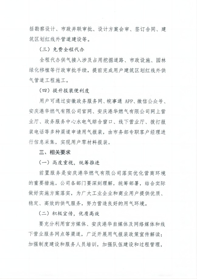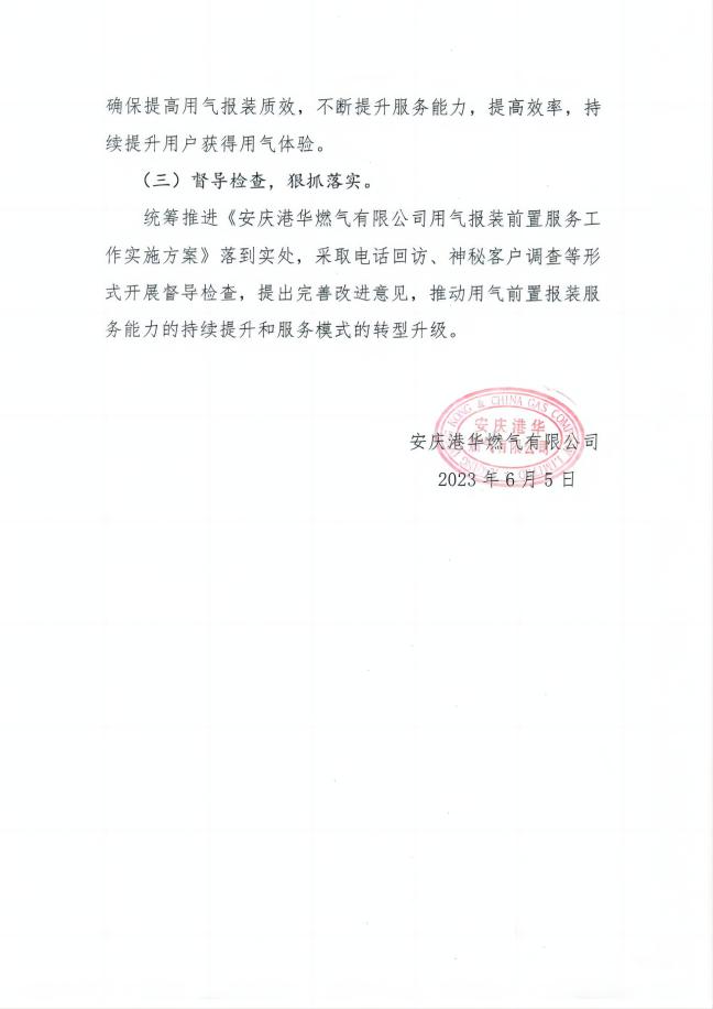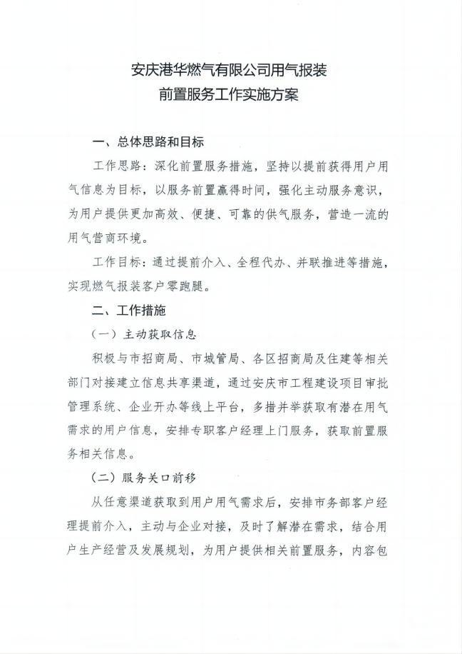 安慶港華燃?xì)庥邢薰居脷鈭?bào)裝 前置服務(wù)工作實(shí)施方案 發(fā)布時(shí)間:2023-06-05    閱讀次數(shù):7807次