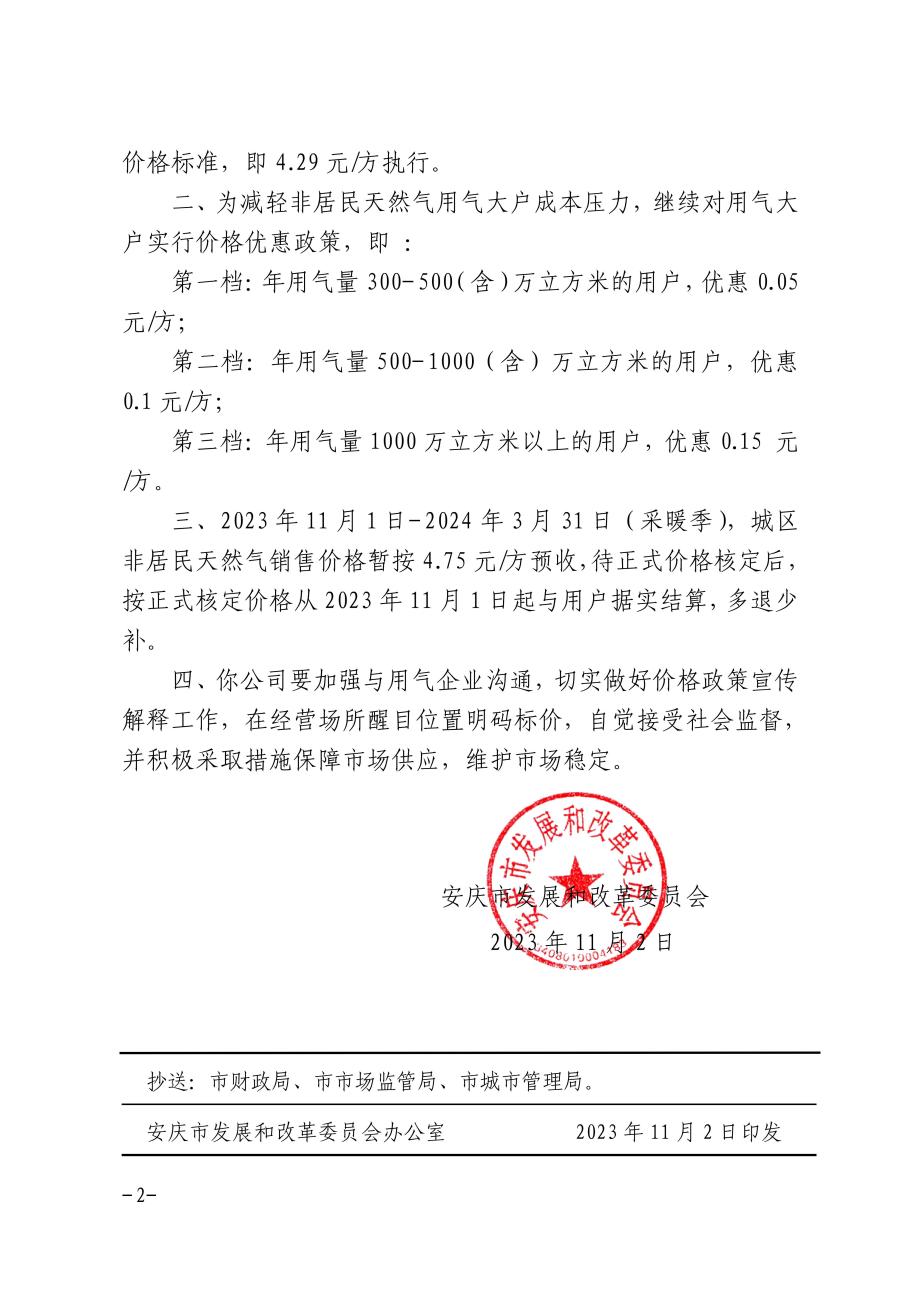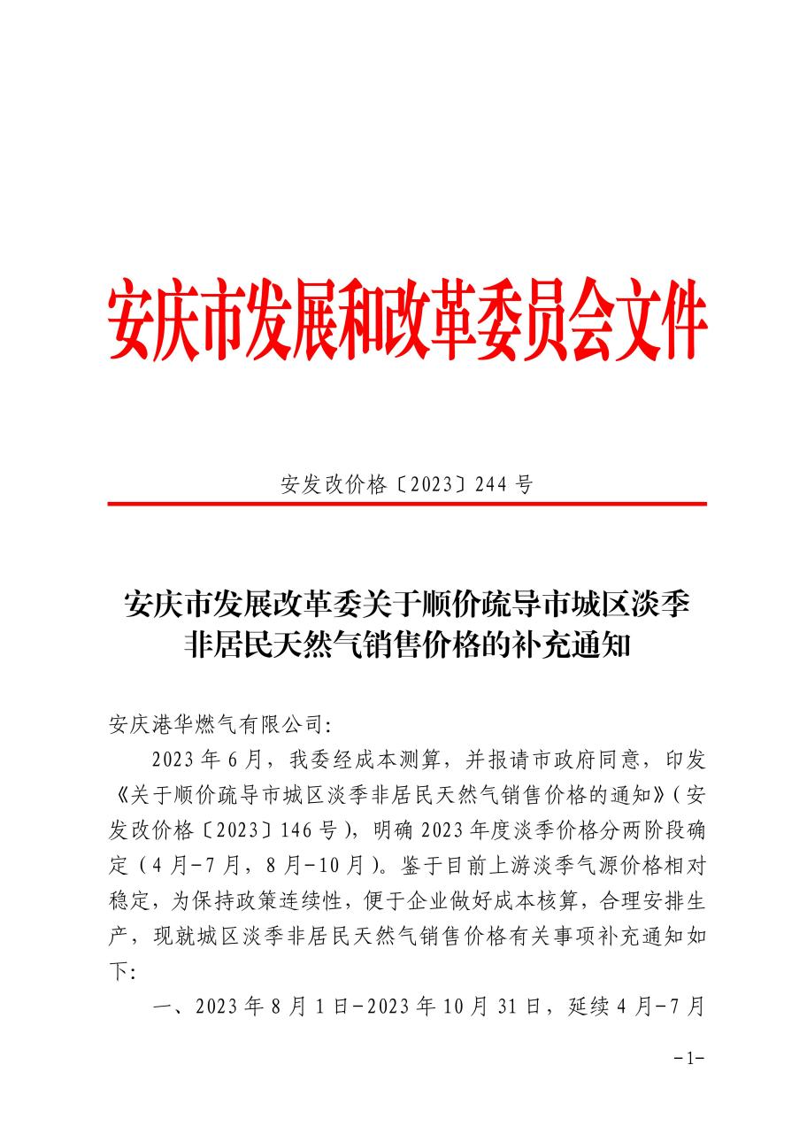 安慶市發(fā)展改革委關(guān)于順價(jià)疏導(dǎo)市城區(qū)淡季非居民天然氣銷(xiāo)售價(jià)格的補(bǔ)充通知