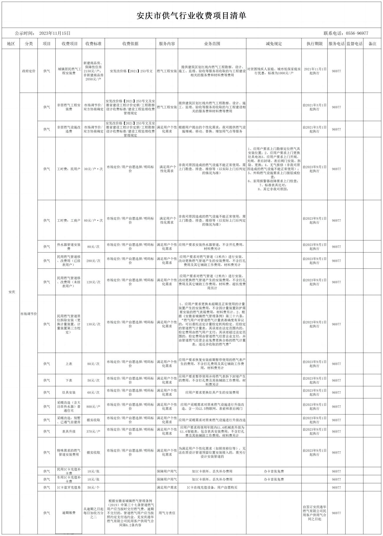 安慶市供氣行業(yè)收費(fèi)項(xiàng)目清單(2023)