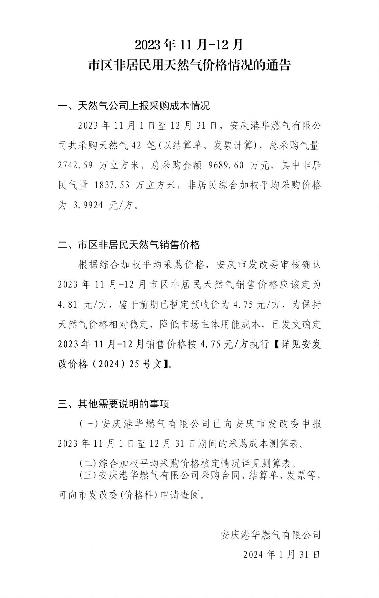 2023年11月-12月市區(qū)非居民用天然氣價格情況的通告
