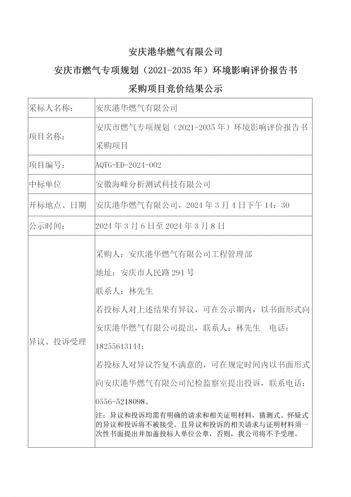 安慶港華燃?xì)庥邢薰?安慶市燃?xì)鈱m?xiàng)規(guī)劃(2021-2035年)環(huán)境影響評(píng)價(jià)報(bào)告書采購(gòu)項(xiàng)目競(jìng)價(jià)結(jié)果公示