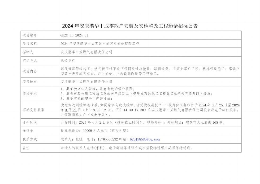 2024年安慶港華中成零散戶安裝及安檢整改工程邀請招標公告
