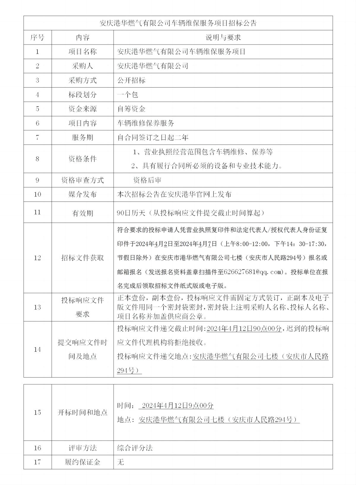 安慶港華燃?xì)庥邢薰拒?chē)輛維保服務(wù)項(xiàng)目招標(biāo)公告