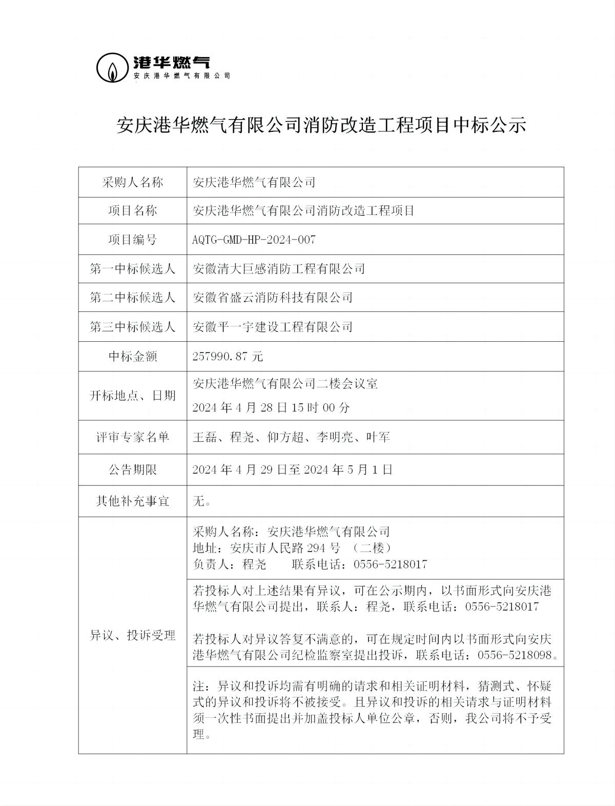 安慶港華燃氣有限公司消防改造工程項目中標公示