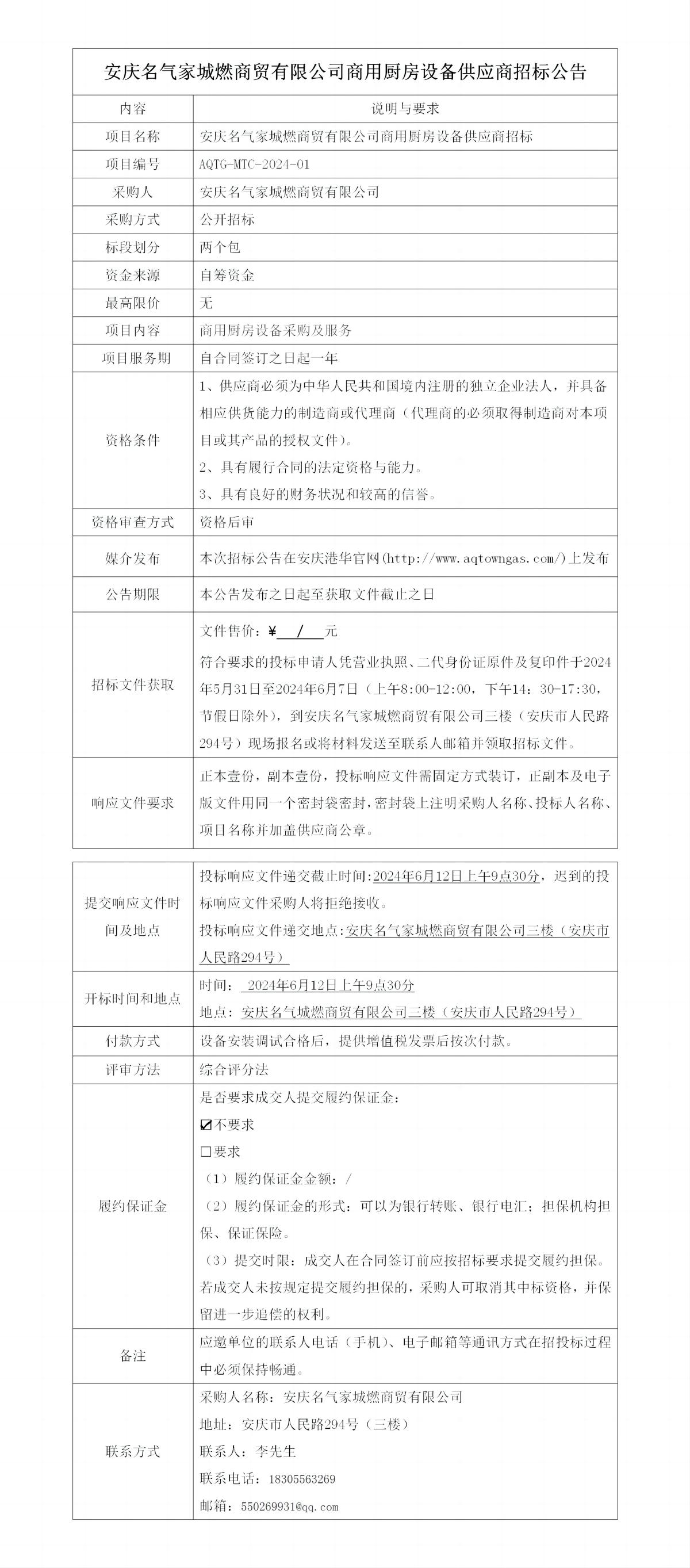 安慶名氣家城燃商貿(mào)有限公司商用廚房設(shè)備供應(yīng)商招標(biāo)公告 發(fā)布時(shí)間:2024-05-31    閱讀次數(shù):3844次