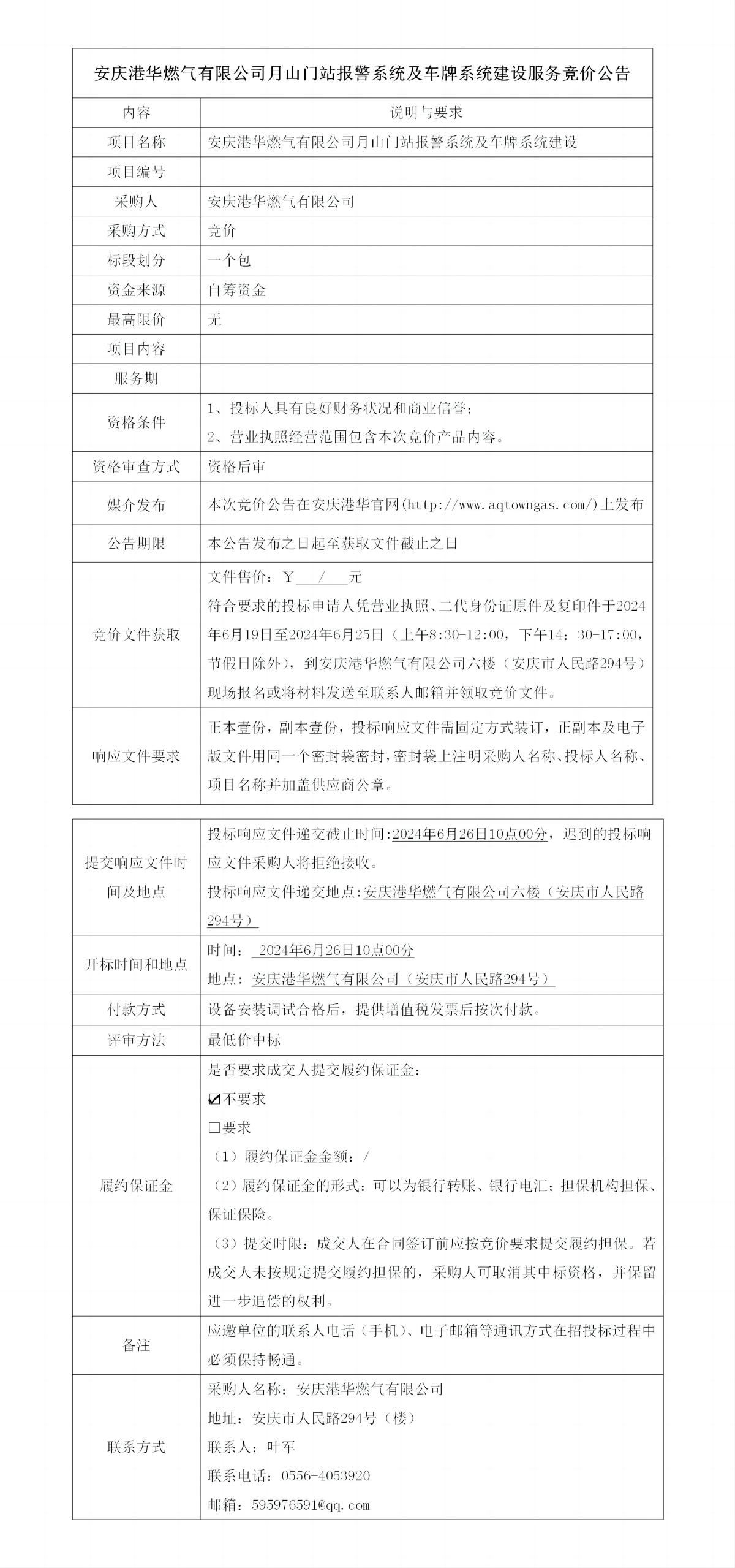 安慶港華燃氣有限公司月山門站報警系統(tǒng)及車牌系統(tǒng)建設服務競價公告