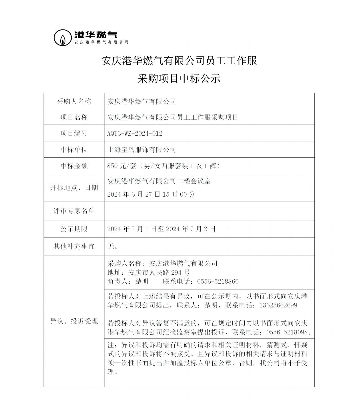 安慶港華燃氣有限公司員工工作服采購項目中標公示 發(fā)布時間:2024-07-01    閱讀次數(shù):3299次