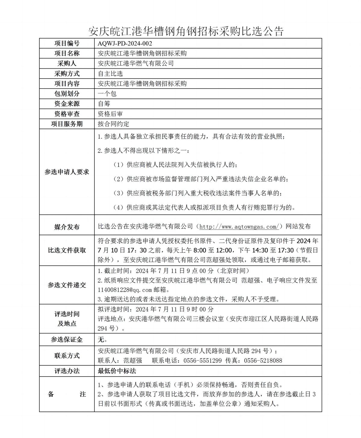 安慶皖江港華槽鋼角鋼招標采購比選公告