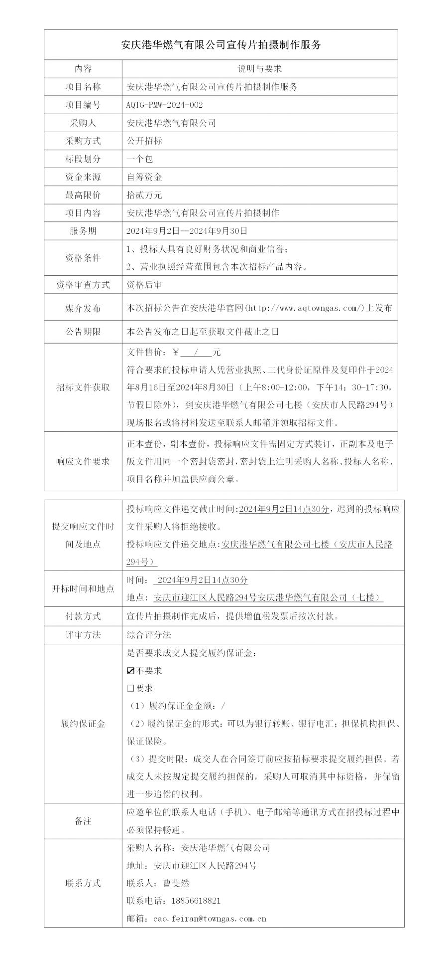 安慶港華燃氣有限公司宣傳片拍攝制作服務項目招標公告