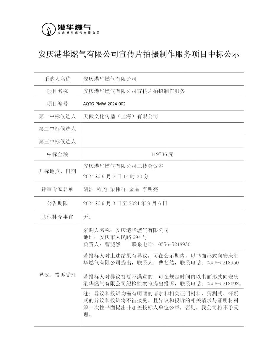 安慶港華燃氣有限公司宣傳片拍攝制作服務項目中標公示