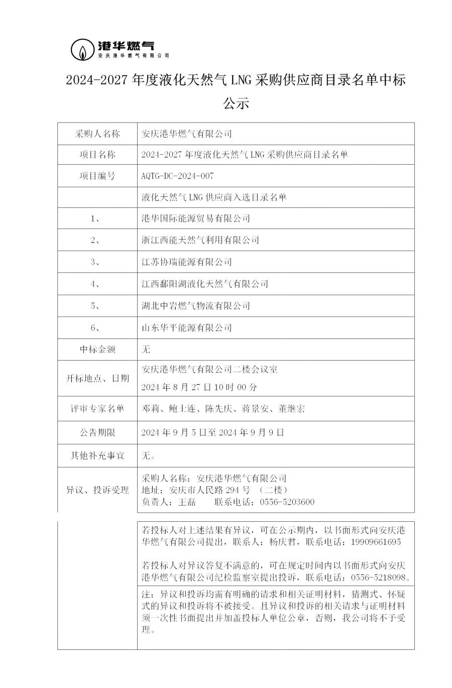 2024-2027年度液化天然氣LNG采購供應(yīng)商目錄名單中標(biāo)公示