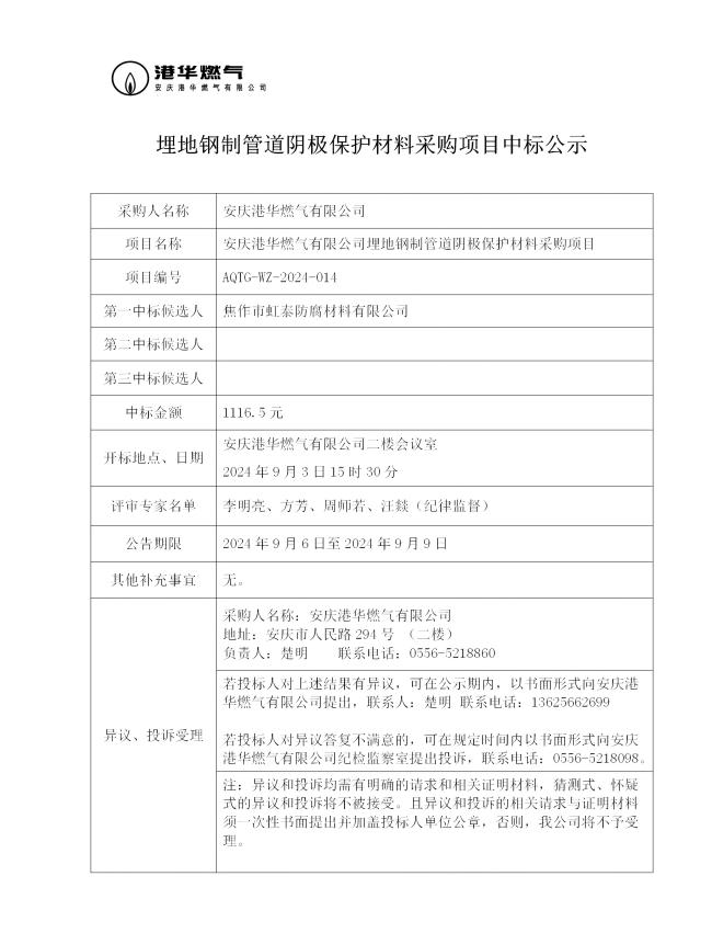 安慶港華燃氣有限公司埋地鋼制管道陰極保護材料采購項目中標(biāo)公示