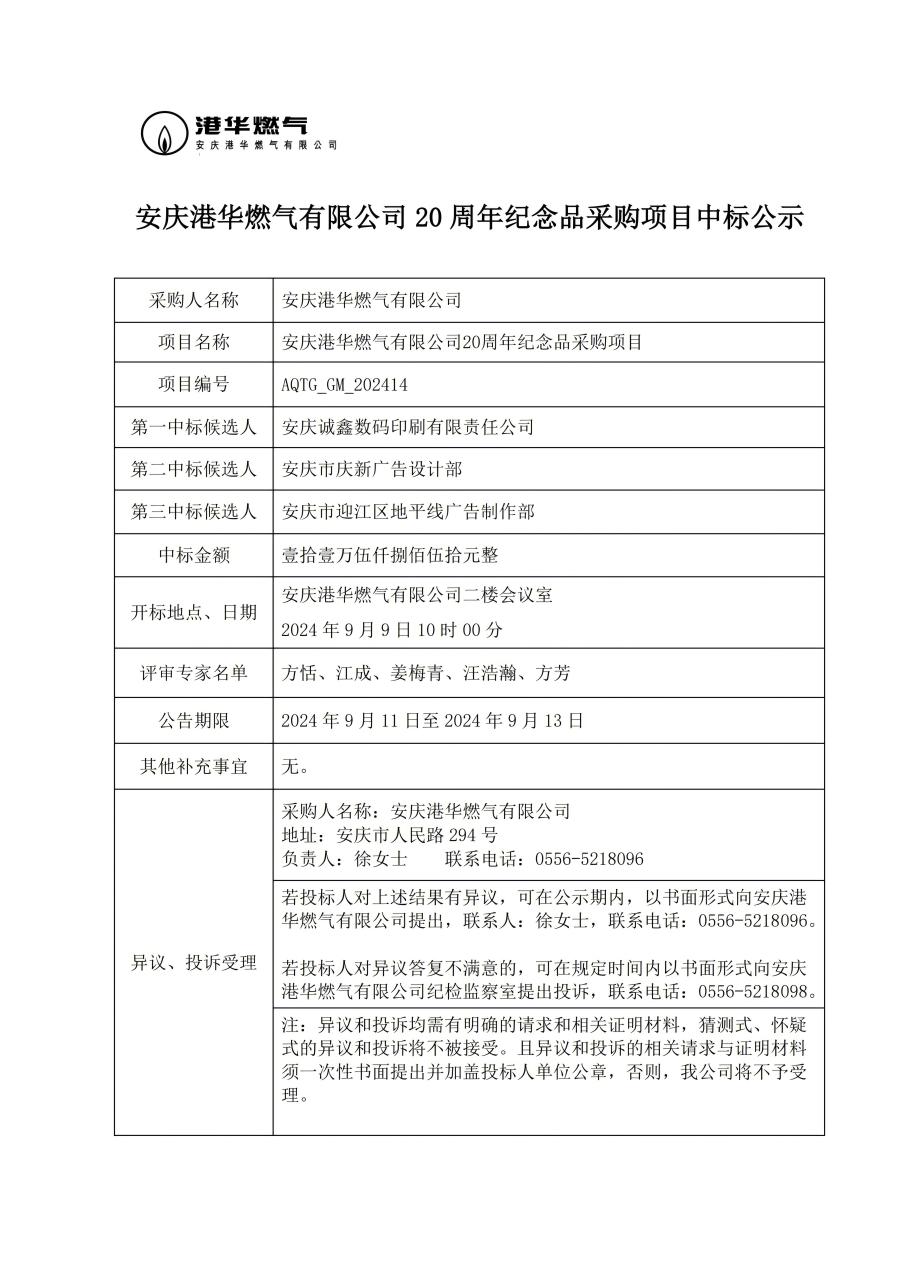 安慶港華燃?xì)庥邢薰?20 周年紀(jì)念品采購(gòu)項(xiàng)目中標(biāo)公示