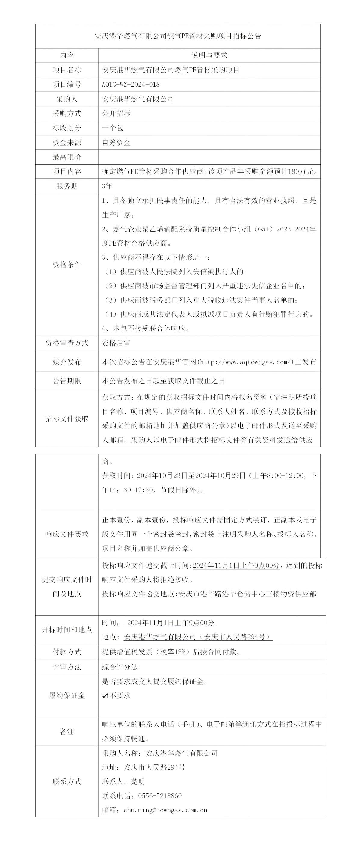 安慶港華燃?xì)庥邢薰救細(xì)釶E管材采購項目招標(biāo)公告