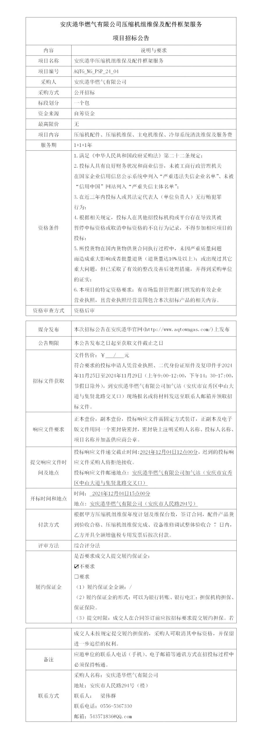 安慶港華燃氣有限公司壓縮機組維保及配件框架服務項目招標公告