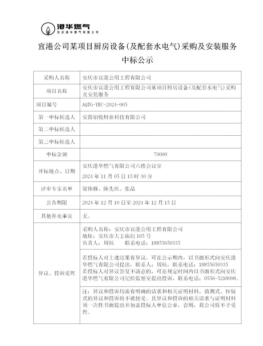 宜港公司某項目廚房設備(及配套水電氣)采購及安裝服務中標公示