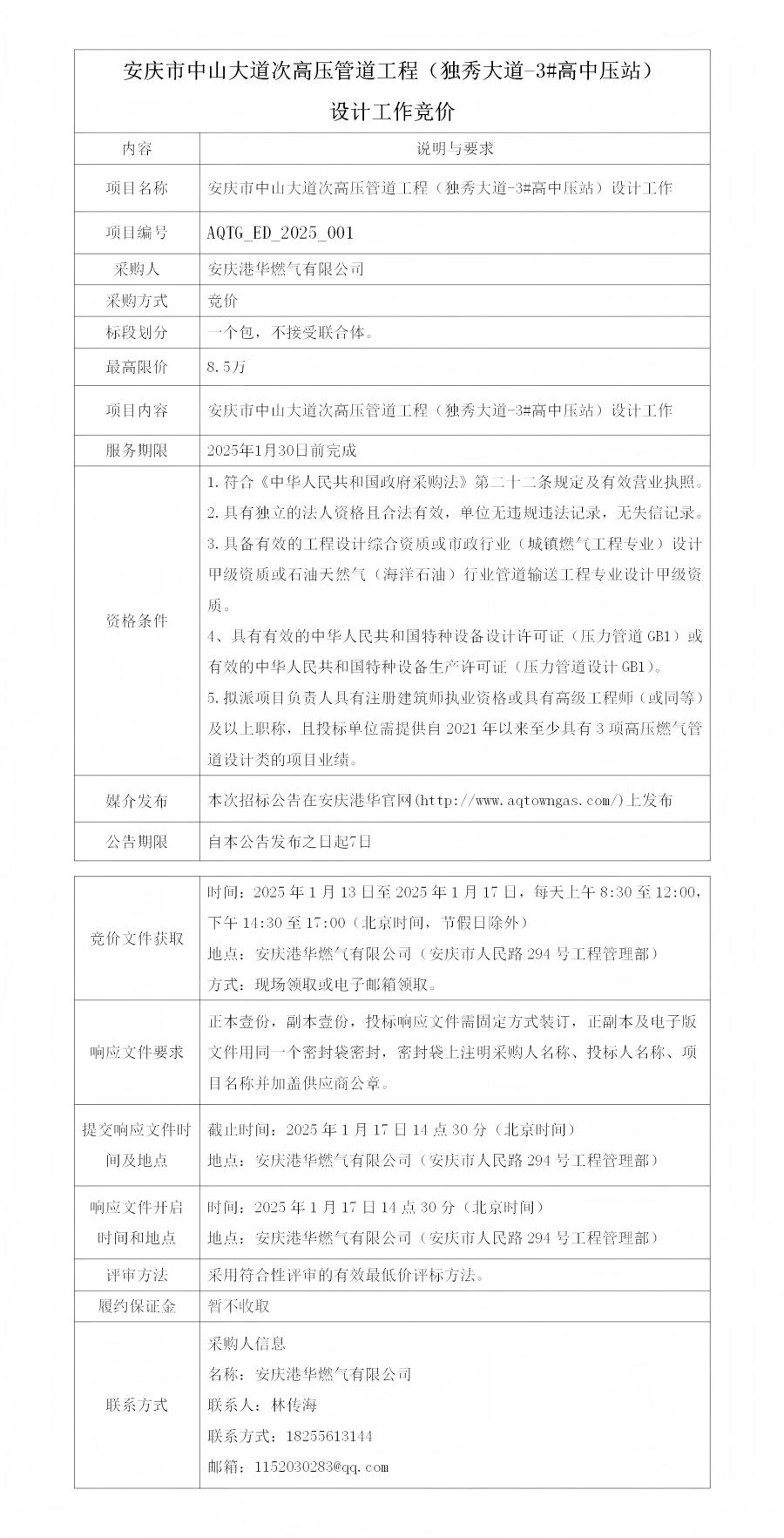 安慶市中山大道次高壓管道工程(獨秀大道-3#高中壓站)設(shè)計工作競價
