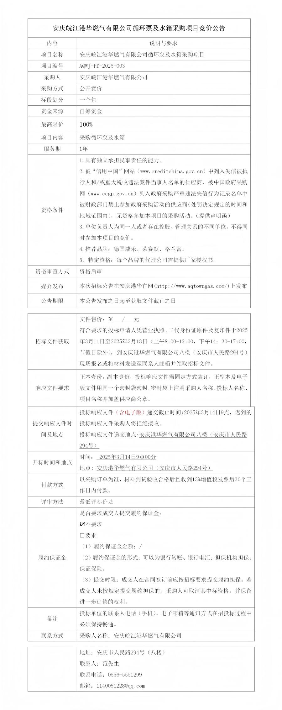 安慶皖江港華燃?xì)庥邢薰狙h(huán)泵及水箱采購項(xiàng)目競價公告