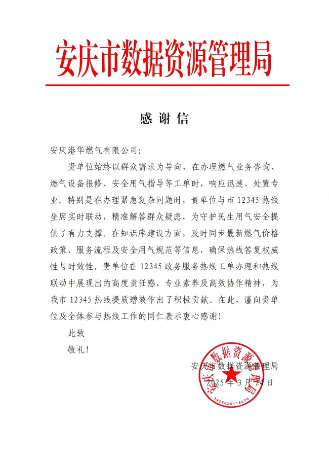 3月24日,安慶市數(shù)據(jù)資源管理局向安慶港華發(fā)來感謝信,對(duì)我司2024年燃?xì)鉄峋€問題辦理的工作成效給予充分肯定。