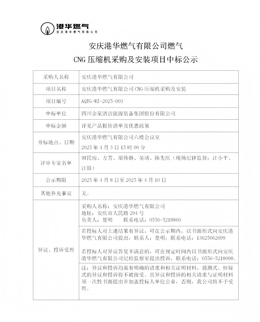 安慶港華燃氣有限公司燃氣CNG壓縮機采購及安裝項目中標公示