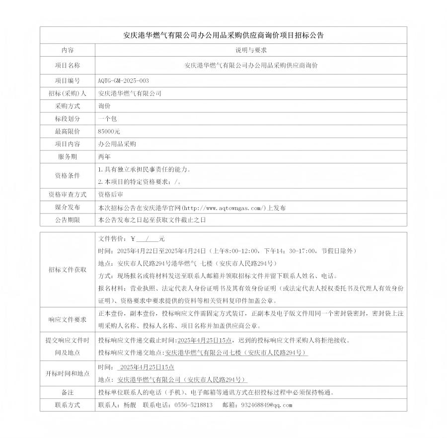 安慶港華燃?xì)庥邢薰巨k公用品采購供應(yīng)商詢價項目招標(biāo)公告