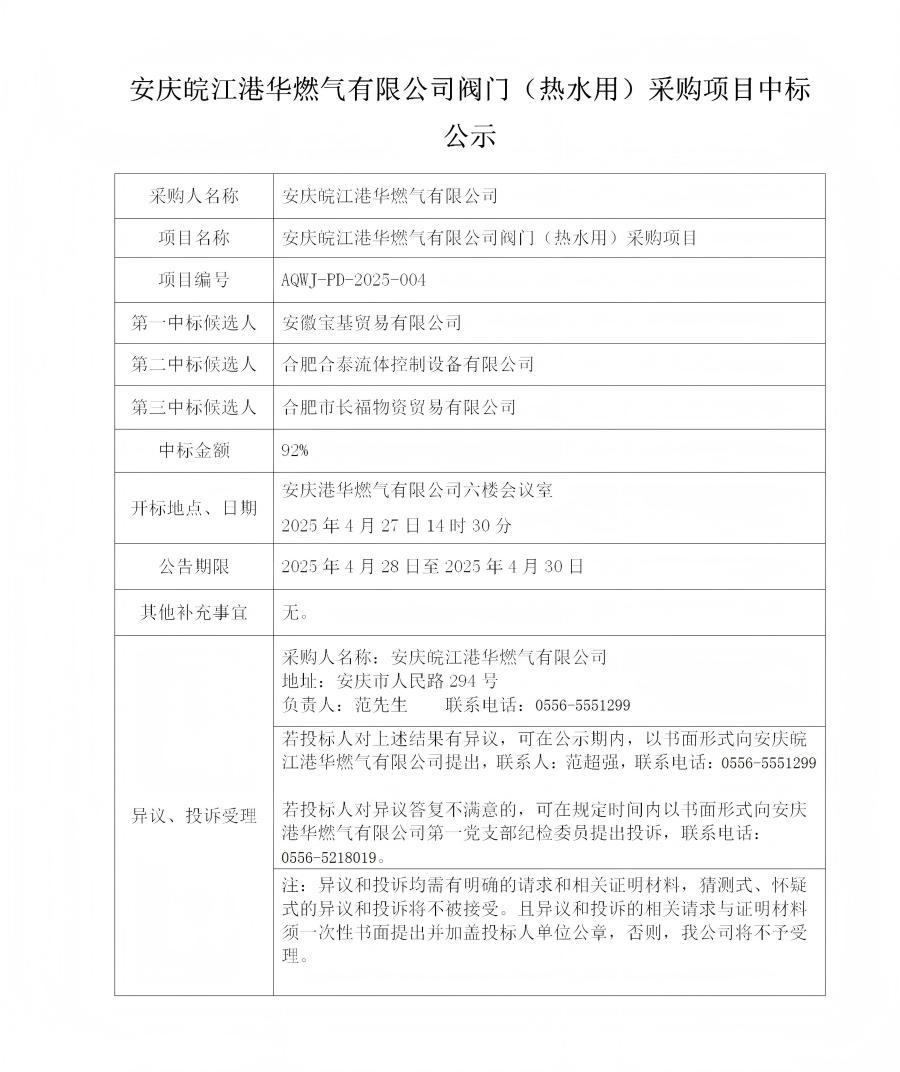 安慶皖江港華燃氣有限公司閥門(熱水用)采購項目中標公示