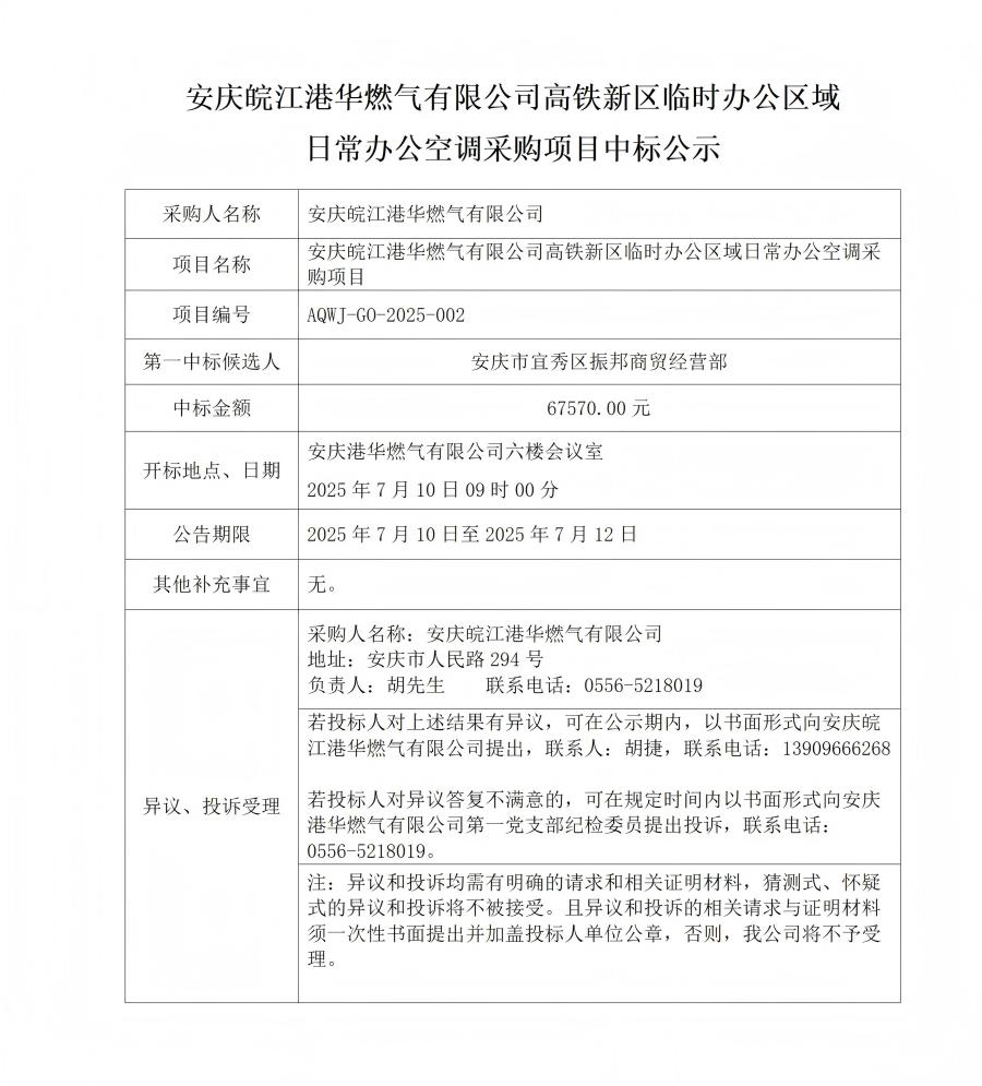 安慶皖江港華燃?xì)庥邢薰靖哞F新區(qū)臨時(shí)辦公區(qū)域 日常辦公空調(diào)采購(gòu)項(xiàng)目中標(biāo)公示 發(fā)布時(shí)間:2025-07-10    閱讀次數(shù):1627次