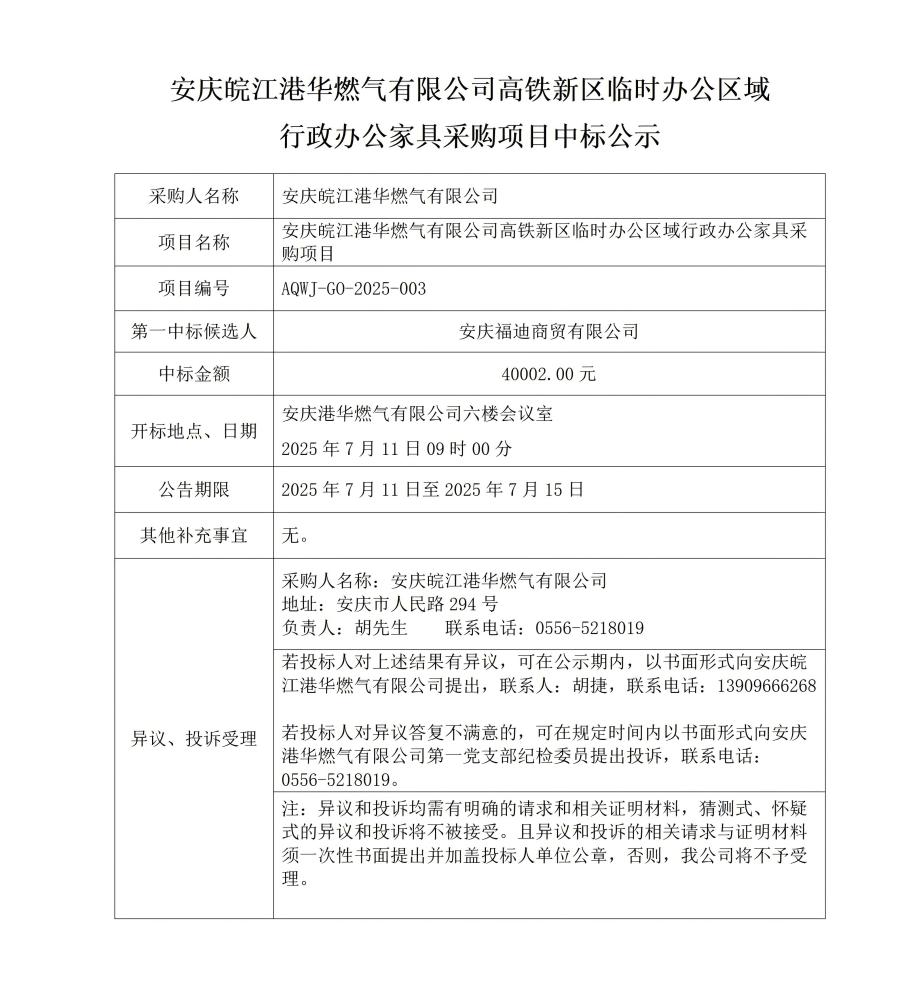 安慶皖江港華燃氣有限公司高鐵新區(qū)臨時辦公區(qū)域行政辦公家具采購項目中標公示