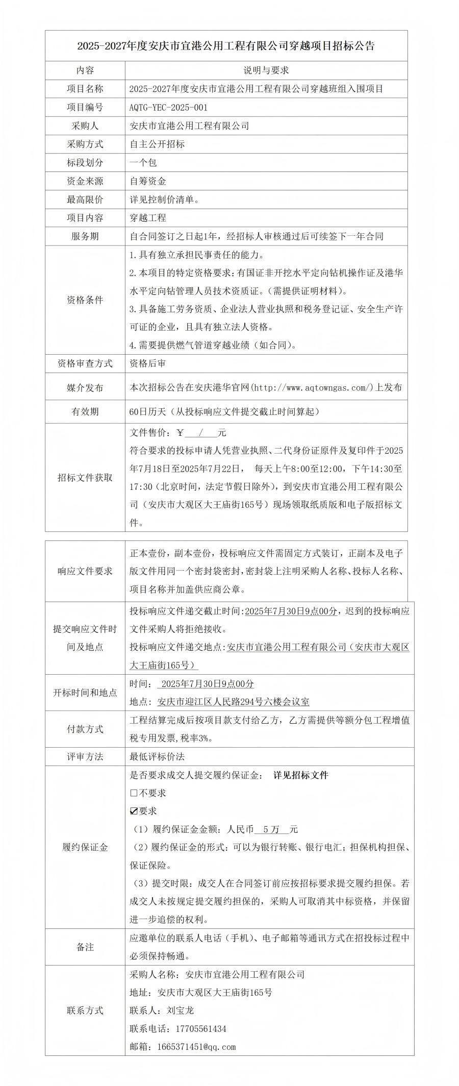 2025-2027年度安慶市宜港公用工程有限公司穿越項(xiàng)目招標(biāo)公告 發(fā)布時(shí)間:2025-07-18    閱讀次數(shù):1634次