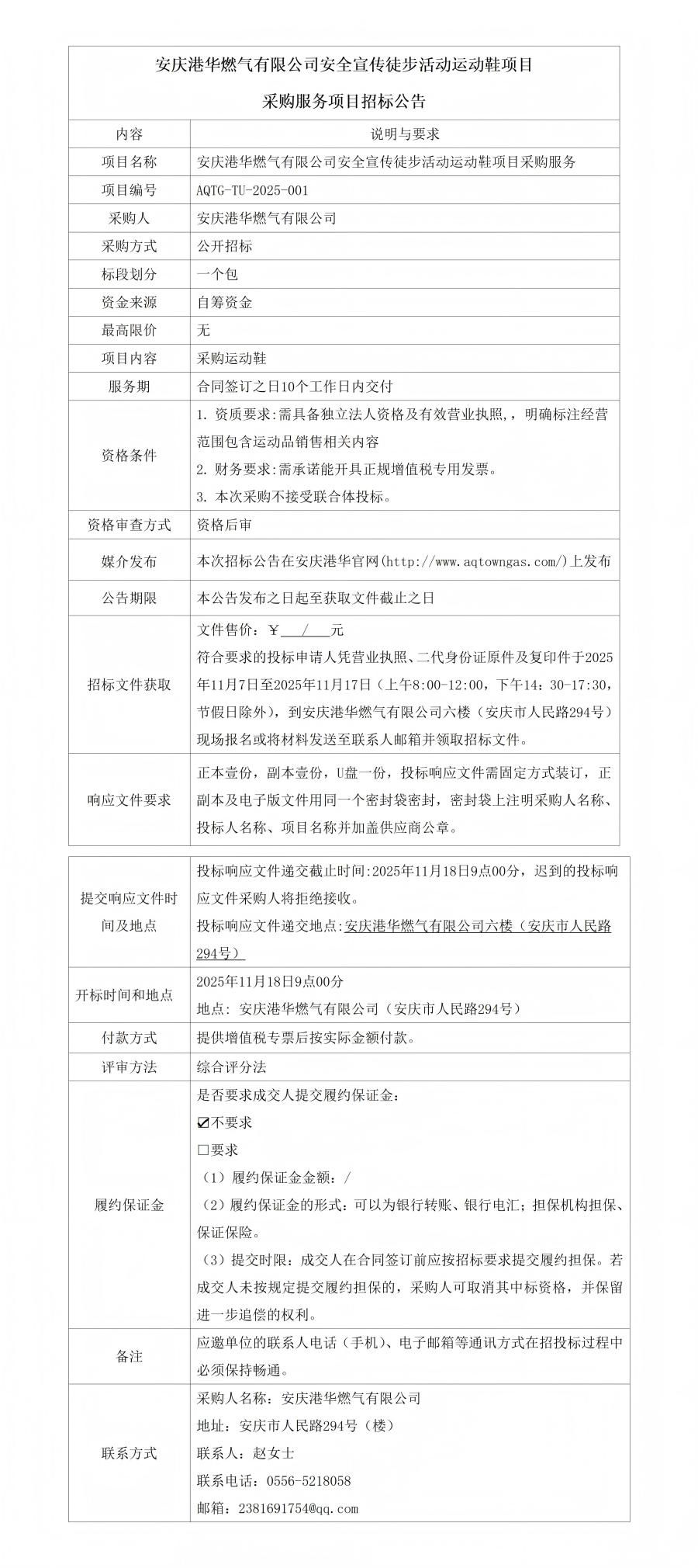 安慶港華燃氣有限公司安全宣傳徒步活動運動鞋項目采購服務(wù)項目招標公告