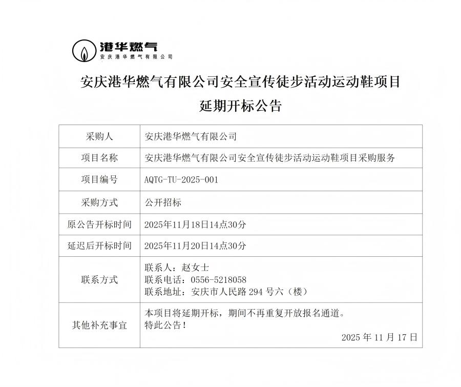 安慶港華燃?xì)庥邢薰景踩麄魍讲交顒?dòng)運(yùn)動(dòng)鞋項(xiàng)目延期開標(biāo)公告
