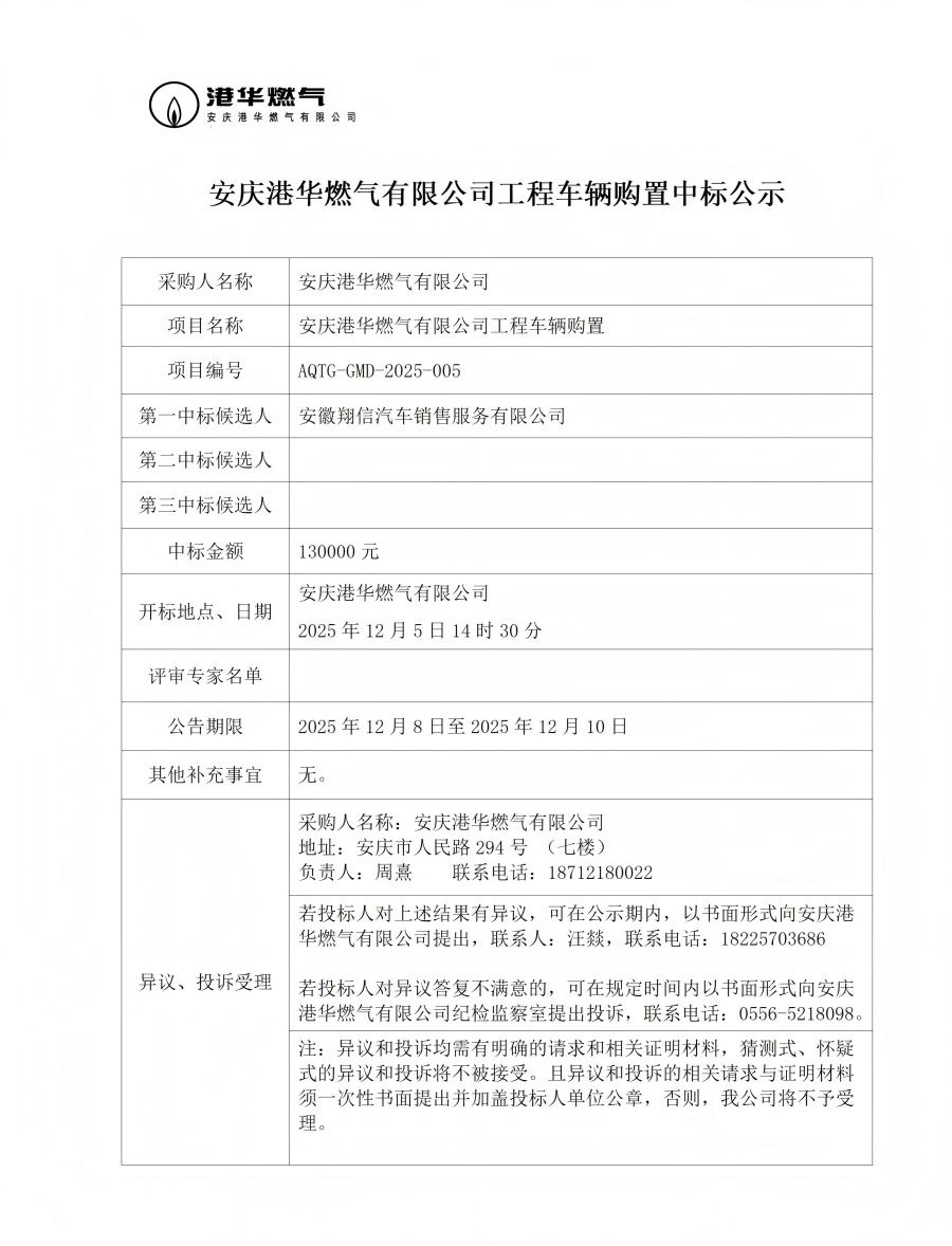 安慶港華燃氣有限公司工程車輛購置中標(biāo)公示 發(fā)布時間:2025-12-08    閱讀次數(shù):614次